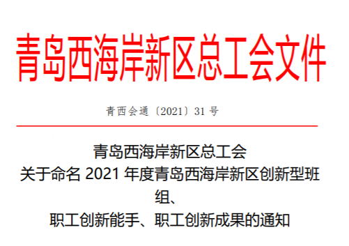 近日,青島西海岸新區(qū)總工會發(fā)布通知,公布“2021年度青島西海岸新區(qū)創(chuàng)新型班組、職工創(chuàng)新能手、職工創(chuàng)新成果”評選情況,公司工程技術(shù)研究中心榮獲新區(qū)創(chuàng)新型班組殊榮,該部門副主任呂靈靈、副主任工程師仉杰當選新區(qū)職工創(chuàng)新能手。[ 查看更多 ]