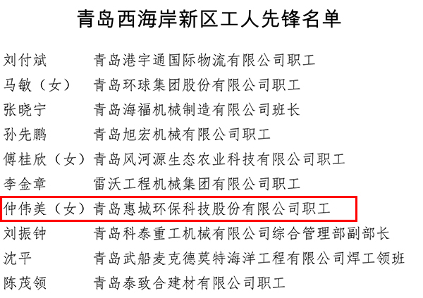 為大力弘揚勞模精神、勞動精神、工匠精神,激勵全區(qū)廣大職工愛崗敬業(yè),爭創(chuàng)一流,日前,青島西海岸新區(qū)總工會發(fā)起了新區(qū)工人先鋒(號)的推薦評選工作。經(jīng)過考察評比,我公司銷售團隊和仲偉美個人喜獲 “工人先鋒號”和“工人先鋒”榮譽稱號。