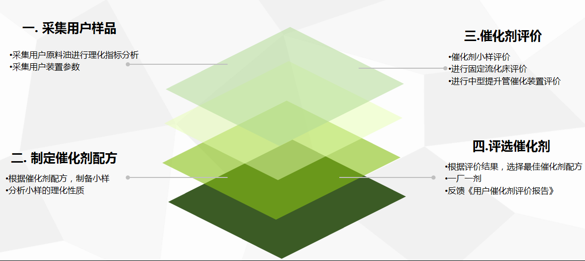 銷售人員負責(zé)售前采集客戶生產(chǎn)工藝數(shù)據(jù)、原料油樣品等,然后交由技術(shù)服務(wù)中心分析,研發(fā)部根據(jù)分析結(jié)果制備催化劑小樣,通過重油微反實驗裝置、固定流化床實驗裝置和中型提升管催化裂化裝置,對催化劑配方篩選和工藝效果實施三級評價,根據(jù)評價結(jié)果靈活調(diào)整催化劑配方重復(fù)試驗并選定最優(yōu)方案交由生產(chǎn)管理部實施定制化生產(chǎn)。